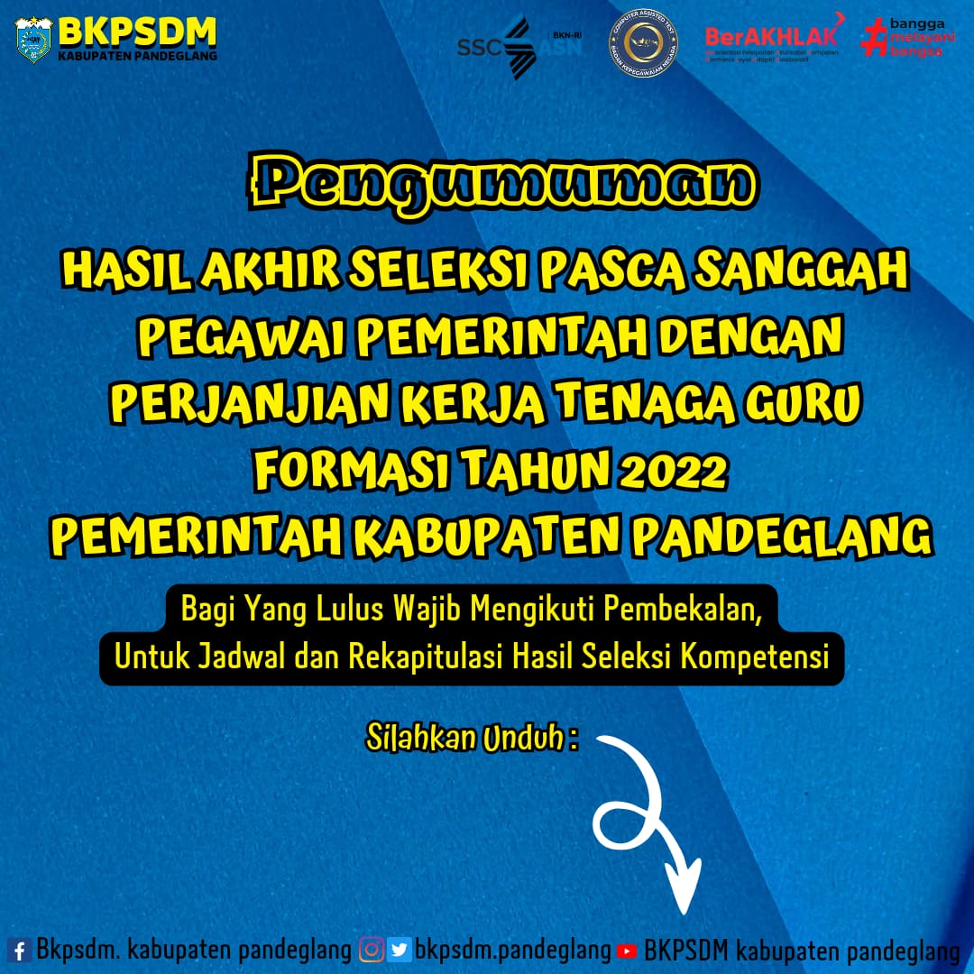 Read morePENGUMUMAN HASIL SELEKSI KOMPETENSI PPPK TENAGA TEKNIS FORMASI TAHUN 2022 KABUPATEN PANDEGLANG.